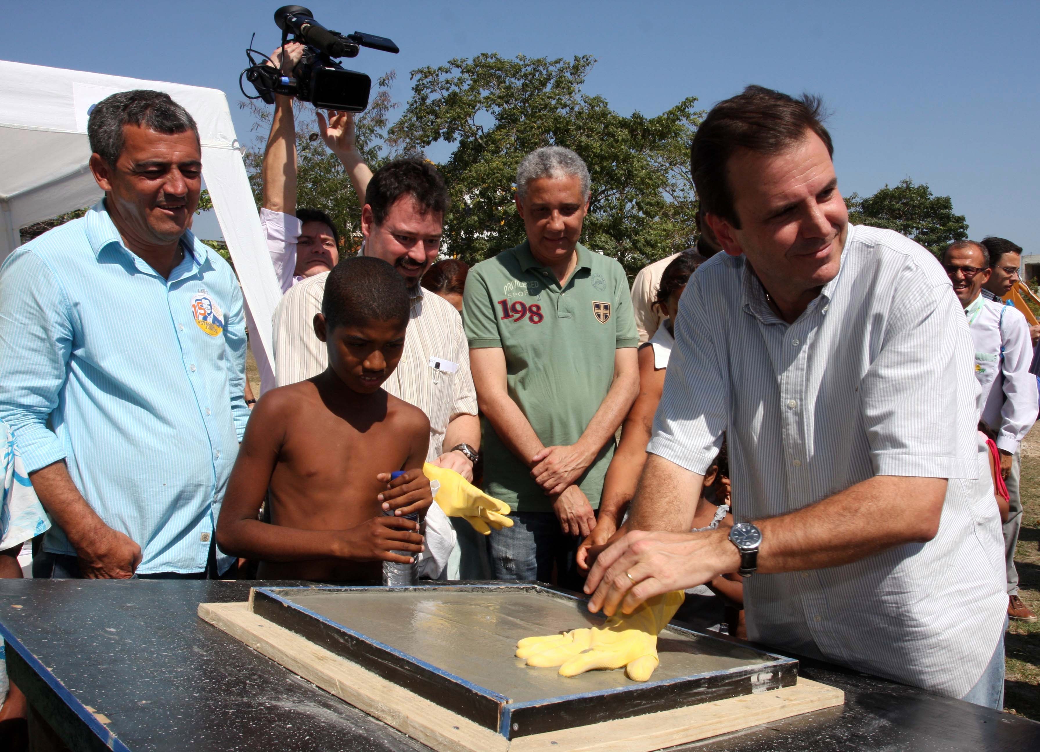 O prefeito Eduardo Paes esteve na tarde de hoje, dia 4, em Santa Cruz, na Zona Oeste, para iniciar as obras de três Espaços de Desenvolvimento Infantil (EDIs). Paes também visitou as obras de pavimentação e drenagem do projeto Bairro Maravilha da comunidade 29 de Março, em Paciência.