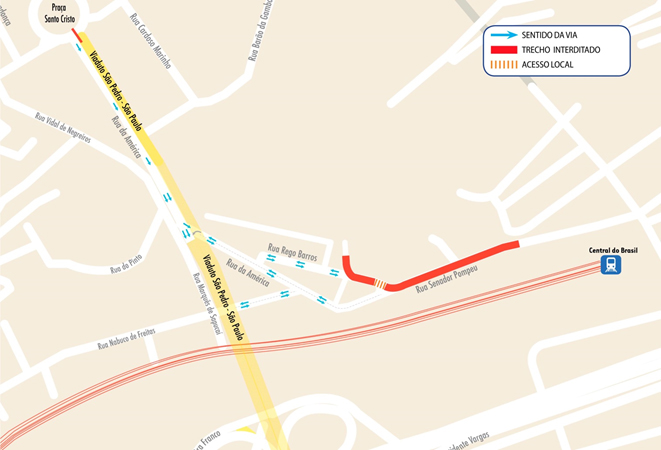 A partir deste sábado (30/05), a Rua Senador Pompeu será interditada entre as ruas da América e Barão de São Félix para implantação do VLT e novas redes de infraestrutura. Vias da Região Portuária também passarão por alterações no trânsito, neste sábado, para obras de implantação do Veículo Leve sobre Trilhos (VLT) e das novas redes de água, saneamento, drenagem, telecomunicações, gás natural, energia e iluminação pública. A operação da Prefeitura do Rio marca o avanço do projeto de mobilidade urbana, modernização do transporte e revitalização da região central da cidade. A Rua da América passará a operar em mão dupla até o encontro com a Avenida 31 de Março, que faz a ligação entre o Santo Cristo e o Túnel Santa Bárbara.