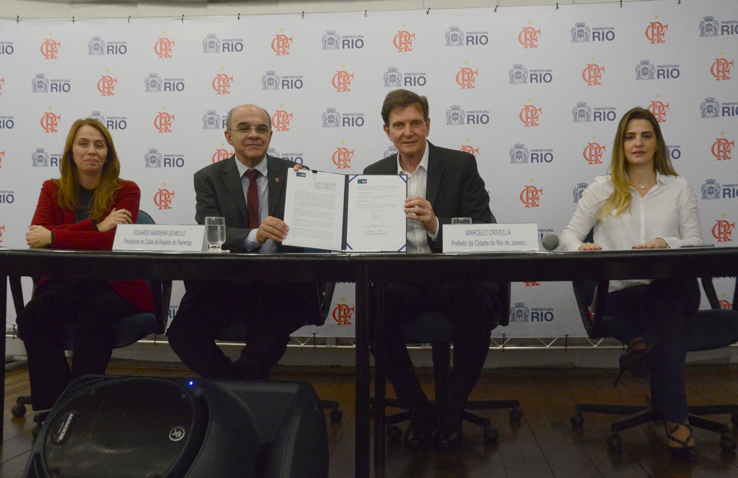 O prefeito Marcelo Crivella e o presidente do Clube de Regatas do Flamengo, Eduardo Bandeira de Mello, assinaram, na manhã desta sexta-feira (12/05), o Protocolo de Intenção para a construção do Estádio Acústico da Gávea. Na ocasião, também foi oficializada a doação pelo clube rubro-negro de 70 mil cestas básicas à prefeitura para viabilizar a reabertura dos restaurantes populares pelo governo municipal. Durante o encontro, que também reuniu a subsecretária de Esportes e Lazer, Patrícia Amorim, a secretária municipal de Desenvolvimento, Emprego e Inovação, Clarissa Garotinho, e o presidente da Riotur, Marcelo Alves, foram divulgados detalhes da festa que acontecerá, a partir das 15h30 deste sábado (13), no Estádio do Maracanã, pouco antes do jogo entre Flamengo e Atlético Mineiro, primeira partida da equipe carioca no Campeonato Brasileiro de 2017. O "Jogo da Solidariedade", que contará com a presença de artistas, também servirá como forma de arrecadação, além de marcar a reabertura do estádio.