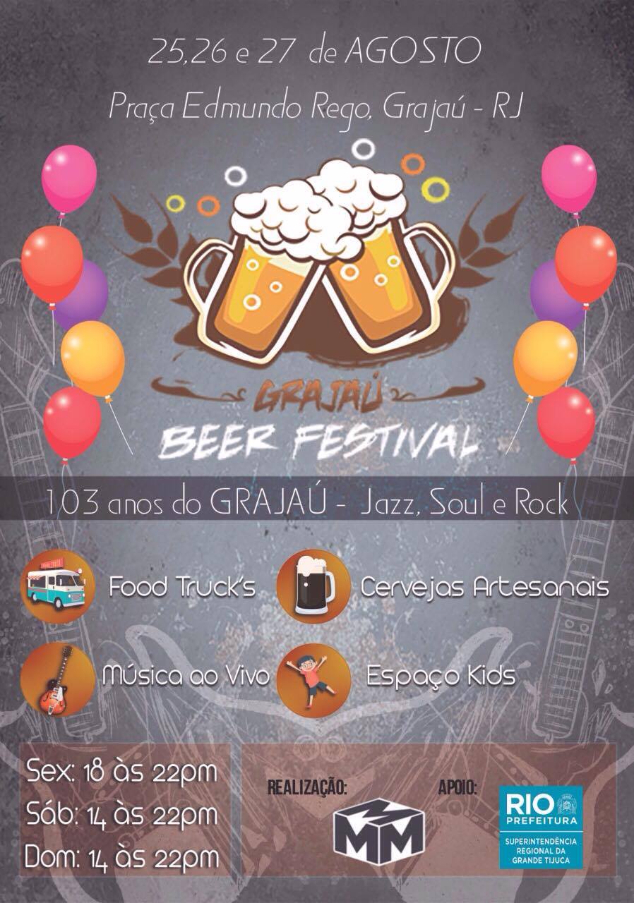 A segunda edição do "Grajaú Beer Festival" foi remarcada para os dias 25, 26 e 27 de agosto (sexta, sábado e domingo). O evento, que acontecerá na Praça Edmundo Rêgo, vai celebrar os 103 anos do bairro. Com apoio da Superintendência Regional da Grande Tijuca, o festival reunirá expositores de cerveja artesanal e gastronomia, com food, beer trucks e food bikes da região. A música ficará por conta de bandas que tocarão pop-rock, rock nacional dos anos 80 e 90, MPB, jazz, blues e rock and roll.