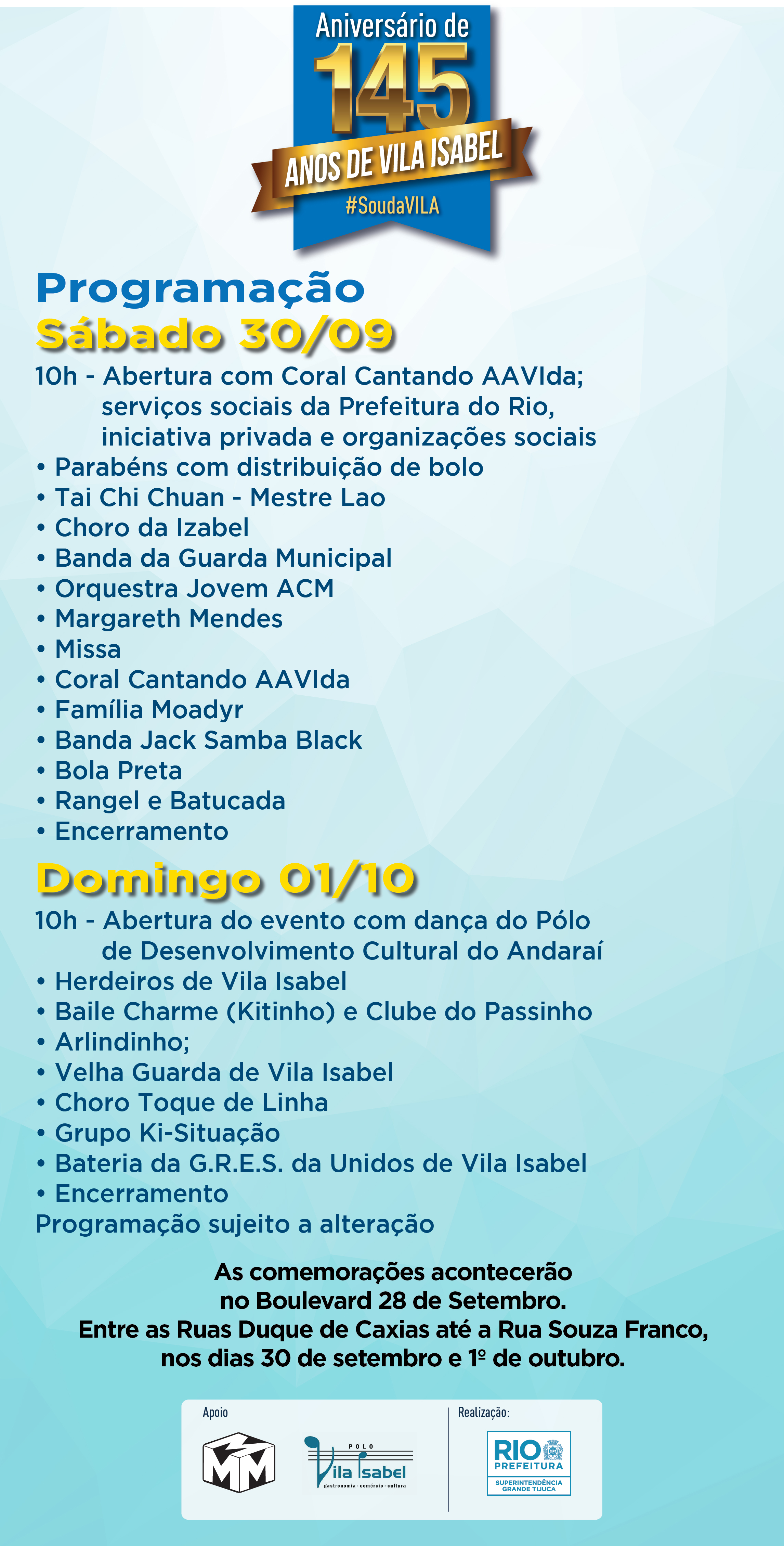 Com o slogan “Com que roupa eu vou pro Samba que Noel me convidou”, Vila Isabel comemora seus 145 anos neste fim de semana, dias 30 de setembro e 1º de outubro, das 10h às 22h, com uma programação para todos os gostos e idades. Desfile do Cordão da Bola Preta, show de Arlindinho (filho do também cantor Arlindo Cruz) e o som animado da bateria da escola de samba que leva o nome do bairro estão entre as atrações da festa organizada pela Prefeitura do Rio. O palco para marcar mais um aniversário do reduto da tradição da boêmia da Zona Norte da cidade não poderia ser outro: o Boulevard 28 de Setembro, entre as ruas Duque de Caxias e Souza Franco.