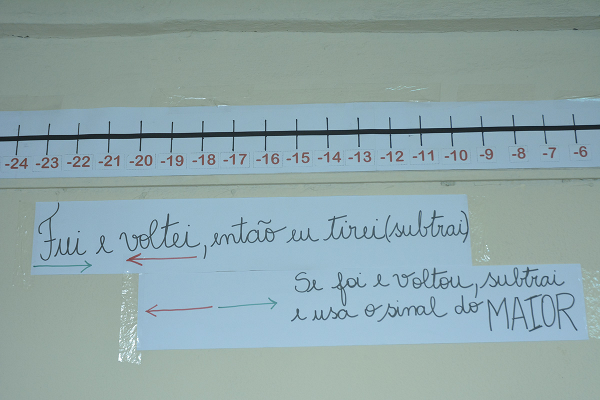 Para atingir seu objetivo, o ambiente na sala de aula foi desenvolvido para atrair os alunos. O chão da entrada é pintando com os vários ângulos que podem surgir ao movimentar a porta. Cada carteira tem uma régua numérica colada cuidadosamente pela professora. Além disso, uma reta numérica, com números positivos e negativos, ocupa todo o comprimento de uma parede. Cartazes coloridos com tabuadas e regras de sinais de multiplicação e divisão também fazem parte do cenário.